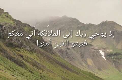 قول الله تعالى: ” إِذْ يُوحِي رَبُّكَ إِلَى المَلائِكَةِ أَنِّي مَعَكُمْ فَثَبِّتُوا الَّذِينَ آمَنُوا سَأُلْقِي فِي قُلُوبِ الَّذِينَ كَفَرُوا الرُّعْبَ فَاضْرِبُوا فَوْقَ الأَعْنَاقِ وَاضْرِبُوا مِنْهُمْ كُلَّ بَنَانٍ” الأنفال 12، و”الوحي” من الله تعالى: الإعلام في سرعة وخفاء، والملائكة خلق من خلق الله تعالى، وجند من جنوده جبلهم على الطاعة والعبادة. فأوحى الله تعالى إلى الملائكة “أني معكم”، ومعية الله تعالى هنا معية تأييد وعون، وهنا خارقة من أعجب الخوارق، وآية من أعظم الآيات؛ فالله تعالى مع الملائكة بالتأييد والعون، والملائكة مع المؤمنين تقاتل وتثبت المؤمنين، وقد ألقى الله تعالى الرعب في قلوب الكافرين.