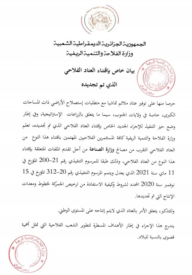 في حين، يندرج الإجراء في إطار الأهداف المسطرة لتطوير الشعب الفلاحية التي تمثل أهمية قصوى بالنسبة للبلاد. كما جاء في بيان الوزارة “حرصا منها على توفير عتاد ملائم تماشيا مع متطلبات استصلاح الأراضي ذات المساحات الكبرى”. “خاصة في ولايات الجنوب سيما ما يتعلق بالزراعات الاستراتيجية”.
