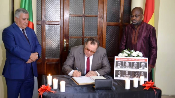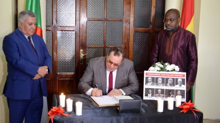 قام وزير الاتصال، محمد مزيان, الاثنين, بمقر سفارة جمهورية غانا بالجزائر, بالتوقيع, باسم الحكومة الجزائرية, على سجل التعازي إثر وفاة وزيري الدفاع والبيئة ومسؤولين سامين آخرين في حادث تحطم مروحية بمنطقة أشانتي جنوب غانا.