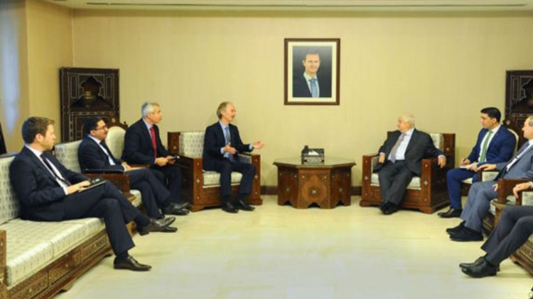 استقبل وليد المعلم نائب رئيس مجلس الوزراء وزير الخارجية والمغتربين الأحد غير بيدرسون المبعوث الخاص للأمين العام للأمم المتحدة إلى سورية والوفد المرافق له.