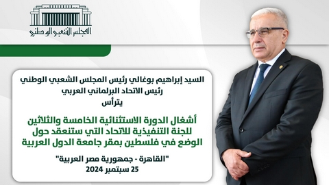 توجه امس إبراهيم بوغالي، رئيس المجلس الشعبي الوطني بصفته رئيس الاتحاد البرلماني العربي ، على رأس وفد من غرفتي البرلمان، إلى القاهرة (جمهورية مصر العربية) حيث سيترأس أشغال الدورة الاستثنائية الخامسة والثلاثين للجنة التنفيذية للاتحاد والتي ستعقد حول الوضع في فلسطين وذلك بمقر الجامعة العربية اليوم الأربعاء 25 سبتمبر 2024. .للإشارة فإن الوفد البرلماني يضم عن مجلس الأمة ساعد عروس رئيس المجموعة البرلمانية للثلث الرئاسي، وعن المجلس الشعبي الوطني النائب عباسي محمد.