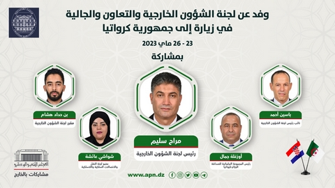 يشرع وفد عن لجنة الشؤون الخارجية والتعاون والجالية، بالمجلس الشعبي الوطني، برئاسة، سليم مراح، رئيس اللجنة في زيارة رسمية لكرواتيا بدعوة من نظيره رئيس لجنة الشؤون الخارجية بالبرلمان الكرواتي، غاري كابيلي، وذلك ابتداء من الثلاثاء، وتستمر إلى غاية 26 ماي الجاري.