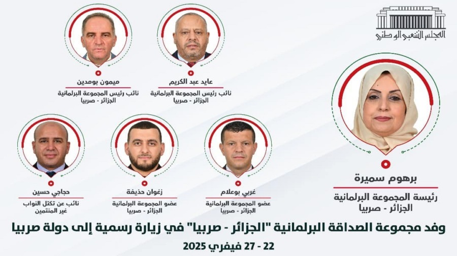 وأوضح نفس المصدر, أن “وفدا من المجموعة البرلمانية للصداقة الجزائر-صربيا, برئاسة السيدة برهوم سميرة, رئيسة المجموعة, يقوم بزيارة رسمية إلى جمهورية صربيا خلال الفترة من 22 إلى 27 فيفري الجاري”.