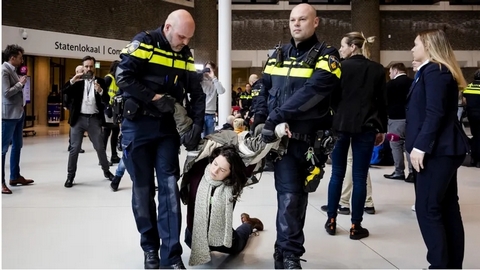 تظاهر، الاربعاء عدد من الهولنديين والنشطاء في داخل مبنى مجلس النواب الهولندي من أجل دعم فلسطين، ورفعوا شعارات تطالب بوقف الحرب على قطاع غزة.
