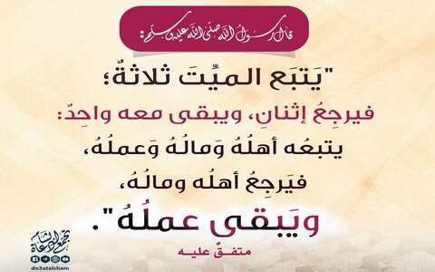 إذا مات العبد وفاضَتْ روحُه إلى باريها، وانتقل إلى ربه، فلن يكون معه بعد موته إلا ما قدَّمه في حياته مِن أعمال، إن كانت صالحة فهنيئًا له؛ فلقد فاز بالخير العظيم، وإن كانت سيئةً ؛ فلقد خاب وخسِر، وضيع نفسه. فعن أنس بن مالك رضي الله عنه قال: قال رسولُ الله صلى الله عليه وسلم: “يتبع الميتَ ثلاثةٌ، فيرجع اثنان ويبقى معه واحد؛ يتبعه: أهله، وماله، وعمله، فيرجع أهله وماله، ويبقى عمله” أخرجه البخاري ومسلم.