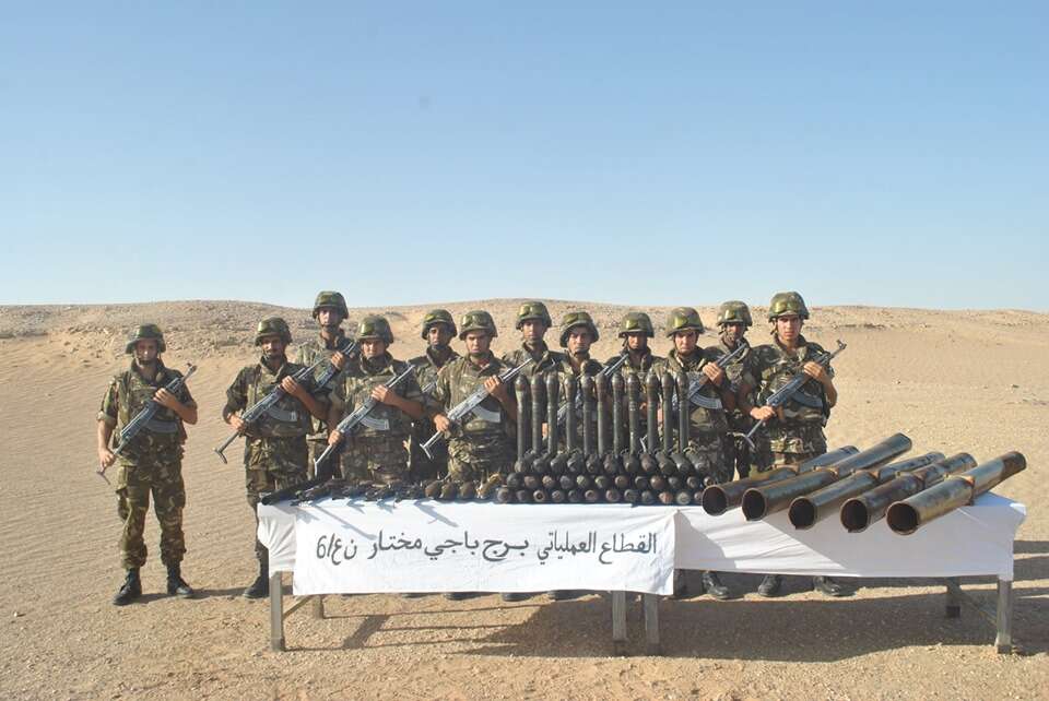 وأعلنت وزارة الدفاع الوطني، الجمعة في بيانها، كشف مفرزة للجيش الوطني الشعبي مخبأ للأسلحة والذخيرة قرب الشريط الحدودي بتمنراست، حيث يحتوي المخبأ على قاذف صاروخي أر بي جي 2، 3 مسدسات رشاشة من نوع كلاشنكوف، إضافة إلى بندقية نصف آلية من نوع سيمونوف، و5 أنابيب إطلاق صواريخ بي أم 13، 47 قذيفة هاون عيار 82، قذيفة للقائف الصاروخي أر بي جي 7، و3 قذائف للقاذف الصاروخي أر بي جي 2.