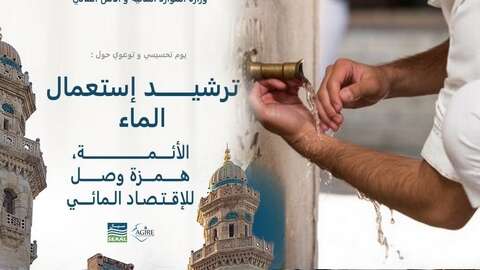 أعلنت وزارة الموارد المائية والأمن المائي، تنظيمها يوما إعلاميا بمعية وزارة الشؤون الدينية والأوقاف، حول ترشيد استعمال الماء لفائدة الأئمة، وذلك بمشاركة ولاية الجزائر العاصمة، بومرداس، وكذا تيبازة والبليدة، والذي يأتي لإرساء ثقافة اقتصاد الماء وترشيد استعماله.