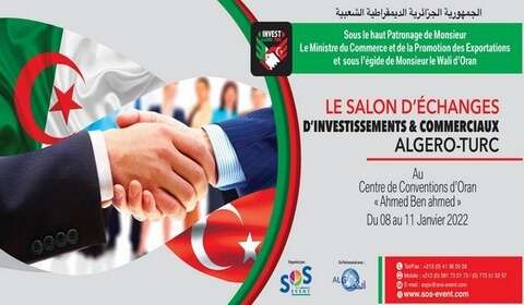 من المنتظر أن يشارك ما يفوق عن 50 متعاملا اقتصاديا جزائريا وتركيا في صالون التبادلات الاستثمارية والتجارية الجزائرية-التركية المزمع تنظيمه من 8 إلى 11 جانفي الجاري بمركز الاتفاقيات “محمد بن أحمد” بوهران.