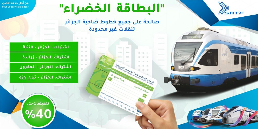 أعلنت الشركة الوطنية للنقل بالسكك الحديدية، عن إطلاقها عروض التخفيضات لحاملي البطاقة الخضراء للتنقل عبر شبكة ضواحي الجزائر، حيث يمكن دفع المستحقات السنوية التي تتغير حسب المسافة، عبر ثلاثة أقساط متتالية.