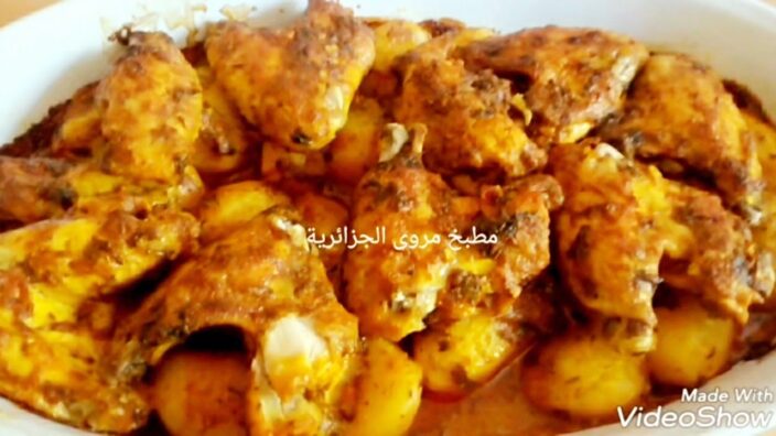 ناخذ إيناء ونضع فيه كل مكونات التتبيلة نمزجهم جيدا نحضر ايناء اخر كبير يدخل الثلاجة ثم ناخد الاجنحة ونغطسهم الواحدة تلوى الاخرى ونضعها بالايناء الاخر ثم ناخد البطاطا ونغطسها هي الاخرى بالتثبيلة ونرصها فوق الاجنحة عند الانتهاء نفرغ ما تبقى من التتبيلة فوقهم ونغلف الايناء بالورق الشفاف وندخله الثلاجة لتتشرب البطاطس واجنحة الدجاج التتبيلة يستحسن لليلة كاملة، في اليوم التالي بصينية تدخل الفرن من الاحسن من الفخار لنتحصل على طعم اطيب الا ان ذلك ستستغرق وقت اطول في الطهي، نرص البطاطس اولا ثم اجنحة الدجاج فوقها دون ان ننسى تفرغة باقي الصلصة فوقهم يغلف الكل بورق الطهي ثم ورق الالينيوم وتدخل لفرن ساخن مسبقا وتتطهى على درجة حرارة 160درجة، عندما تستوي البطاطس واجنحة الدجاد ننزع الاليمنيوم وورق الطهي ونشعل الشواية لتتحمر وتتحصل الاجنحة على القرمشة اللذيذة.