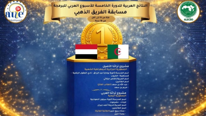 وجاء هذا التتويج مناصفة مع دولة اليمن، في مسابقة الفريق الذهبي للفئة من 13 سنة إلى أقل من 18 سنة، المنظمة في إطار الدورة الخامسة للأسبوع العربي للبرمجة تحت عنوان “الذكاء الاصطناعي والبرمجة في خدمة الثقافة العربية”، بمبادرة من المنظمة العربية للتربية والثقافة والعلوم (الألكسو) وبالشراكة مع الجمعية التونسية للمبادرات التربوية، بتونس، وذلك بمشاركة 18 دولة عربية.