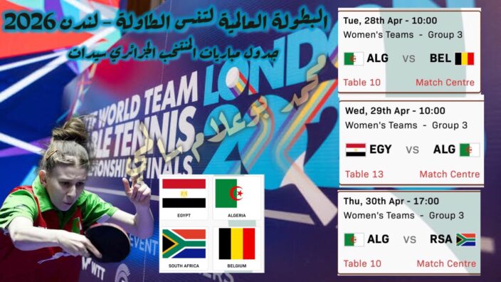 يشارك المنتخب الوطني الجزائري لتنس الطاولة (رجال وسيدات) في البطولة العالمية للفرق المقررة بالعاصمة البريطانية لندن، من 28 أفريل إلى 10 ماي المقبل، إلى جانب نخبة المنتخبات العالمية.