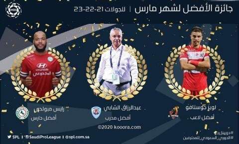 ظفر التونسي عبد الرزاق الشابي مدرب أبها، والبرازيلي لويز جوستافو لاعب الوحدة، والجزائري رايس مبولحي حارس مرمى الاتفاق، بجوائز الأفضل لرابطة الدوري السعودي للمحترفين لشهر مارس الماضي وذلك عن الجولات 21 و22 و23، حيث أقيمت الجولتان 21 و22 قبل فترة التوقف بسبب جائحة كورونا لأكثر من 4 أشهر، فيما أقيمت الجولة الـ23 في الرابع والخامس من أوت الجاري بعد استئناف مسابقة دوري كأس الأمير محمد بن سلمان للمحترفين.