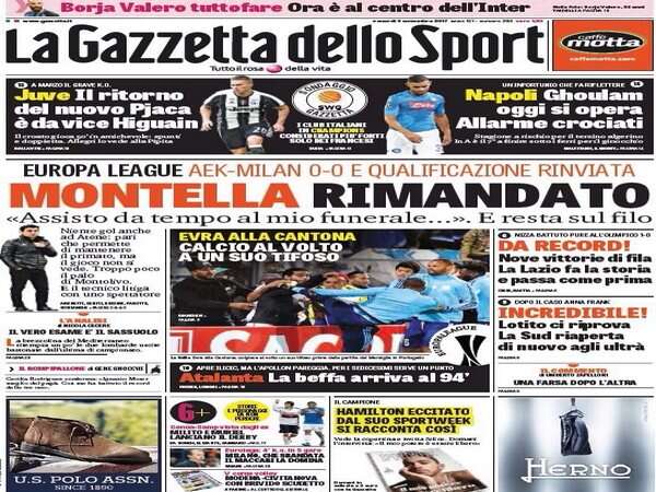 وتحدثت صحيفة “كوريري ديللو سبورت” الإيطالية في غلافها الرئيسي، عن مباراة ميلان قائلة: “ميلان بدون شرارة في أثينا.. مونتيلا يبقى في الآمان.. لازيو أمّن نفسه بالفوز على نيس 1-0”.