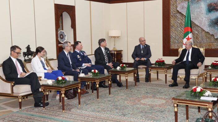 استقبل رئيس الجمهورية، السيد عبد المجيد تبون، القائد الأعلى للقوات المسلحة وزير الدفاع الوطني، نائب كاتب الدولة الأمريكي، السيد كريستوفر لاندو وقائد القيادة العسكرية الأمريكية في إفريقيا (أفريكوم)، الجنرال داغفين أندرسون، والوفد المرافق لهما، حسب ما أفاد به بيان لرئاسة الجمهورية.