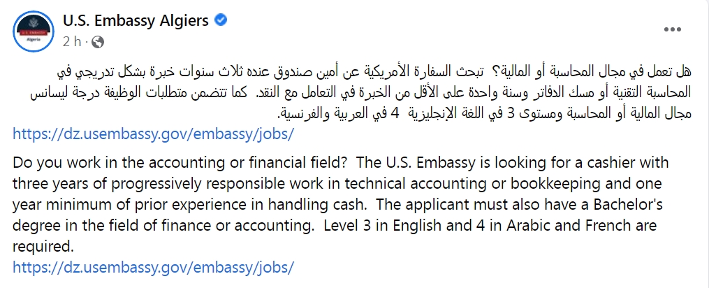 وجاء في منشور للسفارة على صفحتها بفايسبوك: “هل تعمل في مجال المحاسبة أو المالية؟. تبحث السفارة الأمريكية عن أمين صندوق عنده ثلاث سنوات خبرة بشكل تدريجي في المحاسبة التقنية. أو مسك الدفاتر وسنة واحدة على الأقل من الخبرة في التعامل مع النقد”.