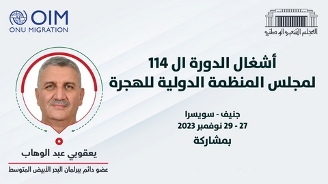 يشارك النائب عبد الوهاب يعقوبي، بصفته عضوا دائما ببرلمان البحر الأبيض المتوسط، في أشغال الدورة الـ114 لمجلس المنظمة الدولية للهجرة، التي تنطلق أشغالها اليوم وتستمر إلى غاية 29 من الشهر الجاري.
