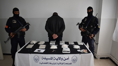 تمكن عناصر فرقة البحث والتدخل بالمصلحة الولائية للشرطة القضائية لأمن ولاية المسيلة من حجز كمية من المخدرات الصلبة (كوكايين) قدر وزنها الإجمالي بأكثر من 5 كيلوغرام مع توقيف شخص يمتهن المتاجرة بهذه السموم، وفق ما ورد، السبت، في بيان لأمن الولاية.