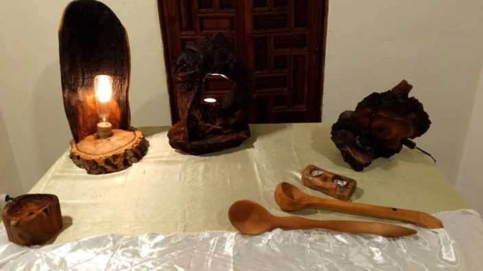ويقول الطاهر مسعودي، الفنان العصامي الذي يجمع خشب أشجار البلوط والزيتون والدردار وغيرها من الغابة، كما يسترجع الخشب من البيوت القديمة ليعيد له الحياة من خلال تشكيلات فنية جديدة، إنه “منذ أن اكتشف قدرته على استنطاق الخشب وتحويله إلى أشكال فنية متنوعة قام بإنجاز العديد من الأعمال”، مضيفا أنه “يستعمل أيضا الإضاءة مع الخشب، حيث تمنحه دفئا ولمسة فنية”.