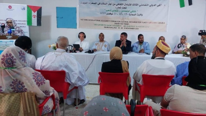 الملتقى الدولي الذي تشرف على تنظيمه وزارة الثقافة الصحراوية، يعقد تحت شعار “نلتقي لنتضامن … نتحاور لنحب” وتتواصل اشغاله على مدار ثلاثة أيام.