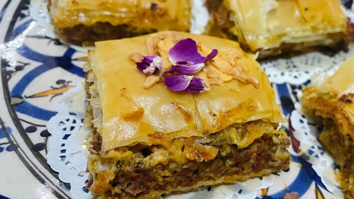 اولا نبدا بتحضير الحشو ليبرد تماما قبل تحضير صينية البقلاوة ولتحضيره نضع بمقلاة على النار الزيت ونقوم بتذبيل البصل جيدا ثم نضيف اللحم المفروم ودون التوقف عن التقليب نقليه جيدا مع البصل مثل حشوة البوراك نضيف التوابل مع الاستمرار بالتقليب يستحسن ان تكون النار متوسطة غير هادئة بعدها نضيف الجبن الطري ونمزج جيدا وفي الاخير نضيف المعدنوس ونطفئ النار ونتركها تبرد تماما.