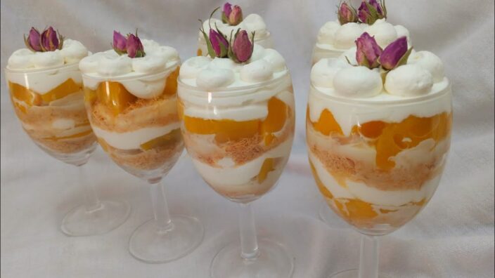 نأخذ كؤوس التقديم نضع كطبقة أولى الكنافة ثم ملعقة صغيرة من الحليب المركز المحلى ممكن تعويضعه هنا بالعسل ثم نضع قطع الخوخ وبعدها الكريمة ثم نعيد الكرة كنافة، حليب مركزمحلى وخوخ…..ثم كريمة التزين حسب الرغبة.
