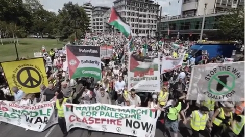 شارك مئات الآلاف من البريطانيين السبت في مسيرة حاشدة وسط العاصمة البريطانية لندن، تأكيدًا على دعم غزة ورفضا للحرب وللمطالبة بوقف بريطانيا تسليح دولة الاحتلال.