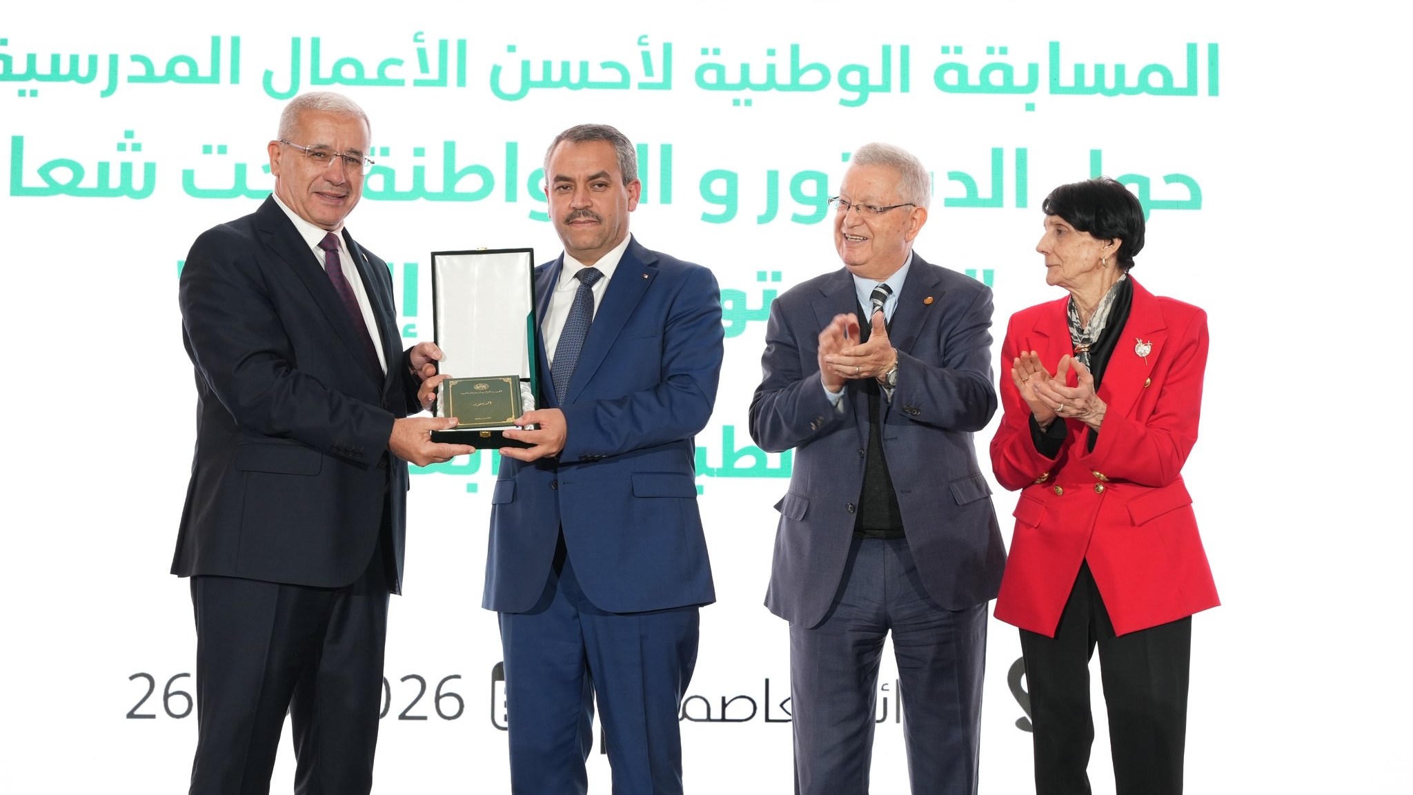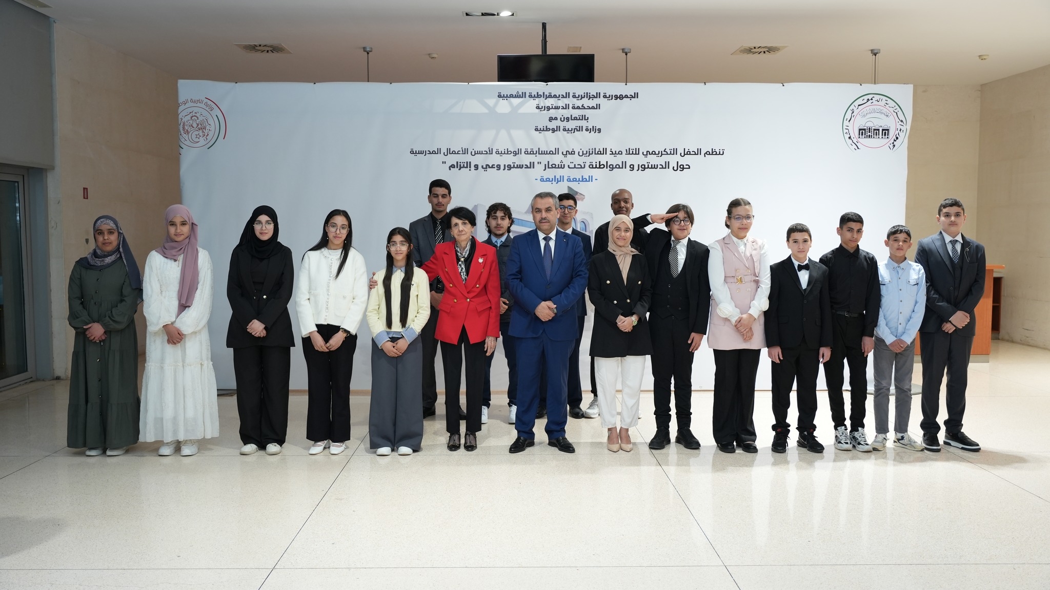 وتم هذا بحضور كل من رئيس مجلس الأمة، رئيس المجلس الشعبي الوطني، مستشار رئيس الجمهورية الجزائرية المكلف بقطاع التربية والتعليم العالي والتكوين المهني والثقافة، وزيرة البيئة وجودة الحياة، رئيسة المجلس الوطني لحقوق الإنسان رئيس السلطة الوطنية لحماية المعطيات ذات الطابع الشخصي، ممثل ديوان رئاسة الجمهورية، الأمين العام لمؤتمر الهيئات القضائية والدستورية الإفريقية، والممثلة المقيمة لبرنامج الأمم المتحدة الإنمائي (UNDP) في الجزائر، التلميذة رئيسة برلمان الطفل الجزائري، وعدد من إطارات الدولة، إلى جانب الأسرة التربوية من تلاميذ وأساتذة وإداريين. وفي كلمة ألقاها بالمناسبة، أكّد الوزير أن هذه المسابقة، المنظمة بالتعاون مع المحكمة الدستورية، تهدف إلى ترسيخ قيم المواطنة وتعزيز الثقافة الدستورية لدى الأجيال الصاعدة، بما يتماشى مع أهداف المدرسة الجزائرية في تكوين مواطن واعٍ بحقوقه وواجباته، قادر على التأثير الإيجابي في محيطه والمساهمة في بناء وطنه. وأشار الوزير إلى الجهود المتواصلة للقطاع في هذا المجال، والتي تجسّدها المشاركة الواسعة للتلاميذ من مختلف أنحاء الوطن، ليتم انتقاء 16 فائزًا وفق عملية تقييم دقيقة أشرفت عليها لجنة وطنية مختصة، راعت معايير الابتكار والجودة الفنية والفكرية والالتزام بالقيم الدستورية. كما أثنى الوزير على الأساتذة المؤطرين والإطارات التربوية والإدارية الذين كان لهم دور محوري في توجيه التلاميذ ودعمهم خلال جميع مراحل المسابقة، مبرزًا أهمية تشجيع التلاميذ على الانخراط في مثل هذه المبادرات التي تساهم في تعميق الوعي بالقوانين الوطنية وتشكيل جيل ملتزم بالمواطنة. وختم الوزير كلمته، بتجديد التزام وزارة التربية الوطنية بمواصلة تعزيز الثقافة الدستورية، وتربية الناشئة على قيم المواطنة الفاعلة، ودعم جميع المبادرات التي تفتح أمام التلاميذ آفاق الإبداع والمشاركة الفعّالة في بناء مجتمع متماسك ومتطور، مثمّناً دور رئيسة المحكمة الدستورية وجميع الشركاء المؤسساتيين في إنجاح هذه المبادرة الوطنية. وتم خلال هذا الحفل، تكريم 16 تلميذًا وتلميذة ومؤطريهم الذين أبدعوا في تقديم أعمال فنية وفكرية مبتكرة تعكس القيم الدستورية وروح المواطنة الفاعلة.