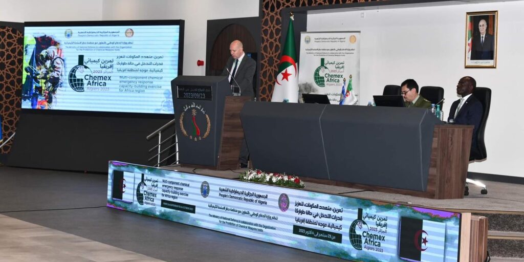 جاء في بيان الممثيلية الدائمة للجزائر بمنظمة حظر الأسلحة الكيميائية، أنّه على هامش مشاركتها في المؤتمر المتواصل بلاهاي (27 نوفمبر – 1 ديسمبر)، نظّمت الجزائر رفقة كندا والأمانة الفنية لاتفاقية حظر الأسلحة الكيمائية، نشاطاً موازياً، الاثنين، حول التمرين الكيميائي متعدّد المكوّنات الموجه للدول الأطراف في اتفاقية حظر الأسلحة الكيميائية عن إفريقيا “كيميكس إفريقيا 2023″، الذي انعقد بالجزائر العاصمة من الثالث والعشرين سبتمبر إلى الخامس والعشرين أكتوبر الفارطين بالتعاون مع أمانة المنظمة.