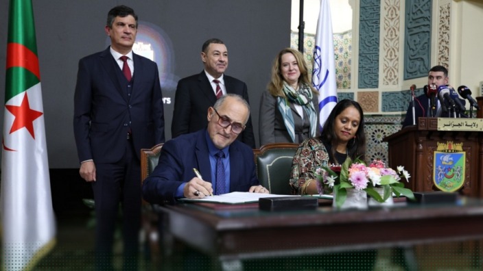 وأشرف على مراسم توقيع هذه الاتفاقية بمقر ولاية الجزائر، وزير الداخلية والجماعات المحلية والنقل، السيد السعيد سعيود، بمعية المديرة العامة للمنظمة الدولية للهجرة، السيدة إيمي بوب، وبحضور الوزير والي الجزائر، السيد عبد النور رابحي، وممثلين عن السلك الدبلوماسي المعتمد بالجزائر.
