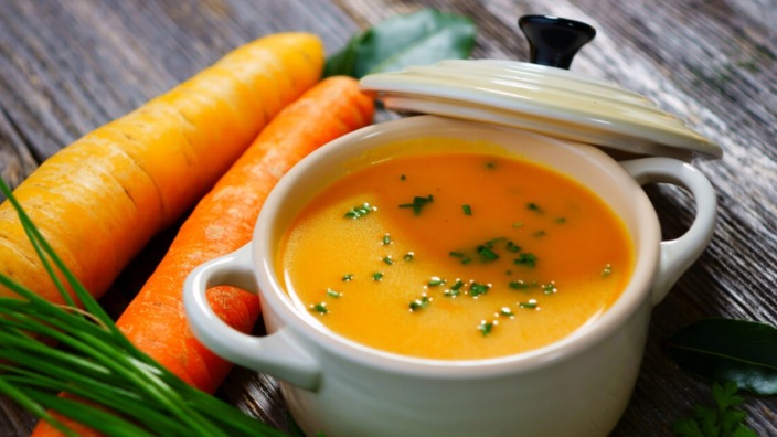 في قدر يقلى الزيت مع البصل والكرافس حتى يذبل البصل نضيف الجزر والبطاطس مع التوابل يقلى جيدا ثم نضيف المرق يفضل ان يكون ساخن عند الغليان نخفف النار ونتركها تطهى حتى تنضج الخضروات تم يطحن في لبلاندر مع اضافة الكريمة الطازجة حسب الرغبة يمكن الاسنغناء عن هذه الاضافة تم نضيف الكزبرة الطازجة