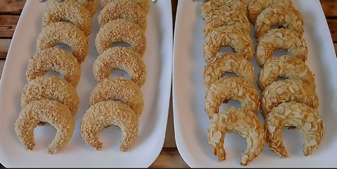 - نضعه في صينية و ندهن وجه الحبة بواسطة خليط (بيضة+فانيلة) و نرمده اللوز المرحي او رقائق اللوز و يطهى