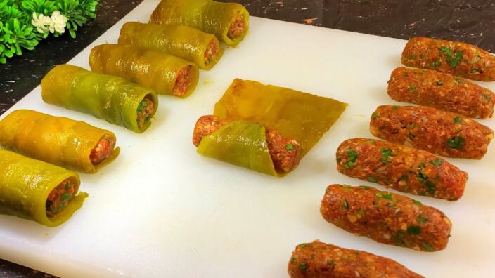 نشكل اللحم المفروم على شكل أصابع ونبدأ بحشي الفلفل بعدما قشرناه ونزعنا له القبعة وفتحناه ونزعنا كل البذور، نبسط شريحة الفلفل ونضع اصبع اللحم المفروم في الجهة الضيقة ونلف الى الاخر ( لكي نتحصل على شكل جميل يجب ان يكون طول الجهة العريضة من الفلفل نفس طول أصابع اللحم المفروم).