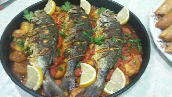 في مقلاة يسخن الزيت وتحمر فيه دوائر البادنجان. توضع دوائر البادنجان في قعر قالب الفرن ويوضع فوقها السمك. تضاف الطماطم الصغيرة والتتبيلة (الشرمولة).