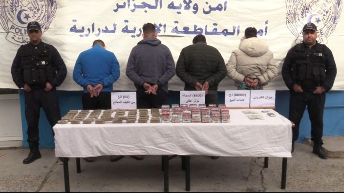 تمكنت مصالح أمن ولاية الجزائر، ممثلة في فرقة الشرطة القضائية بأمن المقاطعة الإدارية الدرارية، الأسبوع المنصرم، من شّ نشاط شبكة إجرامية، تتكون من أربعة أشخاص، مختصة في الاتجار غير المشروع في المخدرات والمؤثرات العقلية، مع ضبط (5) كلغ من المخدرات “كيف معالج” و(8400) كبسولة من المؤثرات العقلية. وذكر بيان لذات المصالح، أن العملية تم تنفيذها عقب تحريات ميدانية مكثفة، التي مكنت المحققين من كشف نشاط الشبكة الإجرامية، ليتم تحديد هوية أفرادها و توقيفهم تباعا، مع ضبط هذه الكمية من السموم. وأضاف المصدر، أن العملية تمت تحت إشراف النيابة المختصة إقليميا، مكنت أيضا من ضبط مبلغ مالي بالعملة الوطنية يقدر بـ(8) ملايين، وكذا و(800) ألف سنتيم من العائدات الإجرامية، إضافة إلى مركبة سياحية تستعمل في نقل السموم وميزان إلكتروني، ليتم في الأخير، تقديم المشتبه فيهم، أمام وكيل الجمهورية، لدى محكمة القليعة، وفقا لملف إجراءات جزائية.