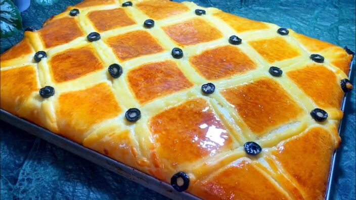 بمساعدة ورق الطبخ حسب حجم الصينية ومرشوش بالقليل من الدقيق نقوم ببسط الكرة الاولى على سمك رقيق نضعها بالصينية مع ورق الطبخ يكون من الاسفل طبعا بواسطة شوكة نقوم باحداث ثقوب خفيفة على سطح العجين ونملؤها بالحشو الذي يكون باردا او دافئا قليلا ثم نضيف على وجه الحشو الجبن المبشور اي نوع حسب الرغبة ثم نبسط الكرة الثانية بنفس الطريقة ونضعها فوق الحشو بمساعدة ورق الطبخ نقوم بغلق العجين مع العجين من ثلات جهات فقط ثم بواسطة الكف نضغط السطح لنخرج الهواء جيدا من الجهة المفتوحة ثم نغلق الجهة الرابعة ونقوم بدهنها بصفار البيض ، وبواسطة سكين نقوم بتشكيل خطوط على سطحها دون شق العجين لنتحصل على شكل معينات كبيرة بعدها بواسطة جيب حلواني نضع فوق تلك الخطوط الجبن الابيض الطري جدا ونزين بالزيتون الاسود ندخلها لفرن مسخن مسبقا حتى تاخد اللون الذهبي المحمر الجميل.