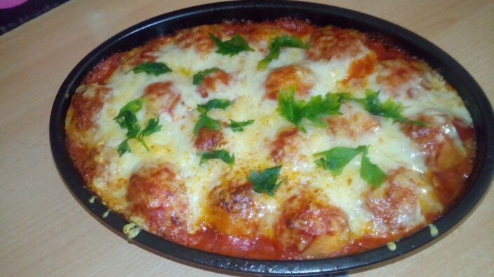 نأخد صينية تدخل الفرن نفرغ فوقها نصف كمية الصلصة وناخد كمية كرة صغيرة من بوري البطاطا ونحشيها بقطعة من المرقاز ونرصها فوق الصلصة وهكذا حتى ننهي كل الكمية ثم نفرغ فوق الكريات باقي كمية الصلصة ،ثم نغطيهم بالجبن المبشور وندخلهم لفرن ساخن لتتجمر وتاخد اللون الذهبي .