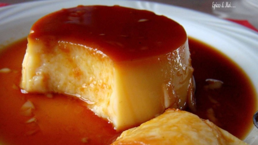في إناء نضع الحليب على النار متوسطة حتى يصل درجة الغليان وفي ذلك الحين نقوم بخفق بالضراب اليدوي جيدا البيض مع السكر والفانيلا ثم نضيف له وبالتدريج الحليب مع التحريك المستمر والسريع لكي لا يطبخ البيض، نضيف الحليب بالتدريج حتى تصل درجة حرارة البيض درجة حرارة الحليب، حينها نضيف كمية الحليب المتبقية دفعة واحدة دائما مع التحريك المستمر، في الأخير نصفي الخليط