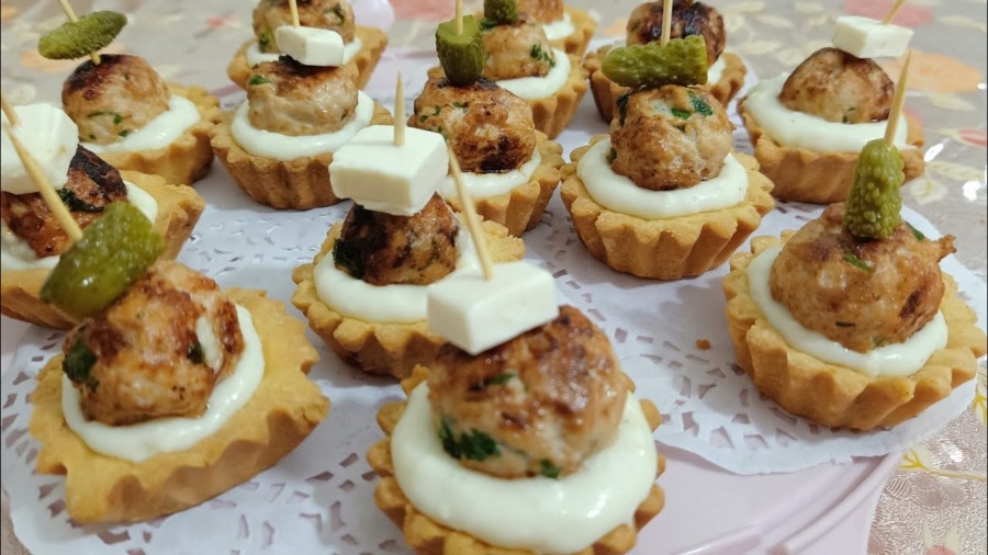 في إناء نضع مفروم الدجاج والبصل والبقدونس والثوم والملح والفلفل الأسود والسكنجبير، نعجن الكل ثم نشكل كرات صغيرة تناسب حجم التارت تحفظ بالثلاجة لحين قليها، تقلى حتى تأخذ اللون الذهبي الجميل.