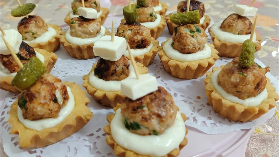 نضع كريمة الجبن بعد خفقها جيدا بالفوي بكيس حلواني، نملأ قاعدة الترتات نأخذ كرات الدجاج المقلية نثبت فوقها مكعبات الجبن أو زيتون أو طماطم كرزية أو كورنيشو بواسطة أعواد التثبيت وتوضع فوق الكريمة.